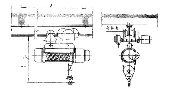 2、吊動葫蘆高度H,即電動葫蘆安裝在工字鋼軌道上后,電動葫蘆吊鉤極限位置到工字鋼軌道底面的距離,這個距離可以在產(chǎn)品樣本上查到,通常1~5噸電動葫蘆,H=685~1031毫米。