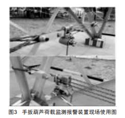 該裝置在昆明供電局架空輸電線路進行了23次應用,能準確測量手扳葫蘆的受力,超限時能及時報警,降低了作業風險。 手扳葫蘆荷載監測報警裝置現場使用圖如圖3所示。