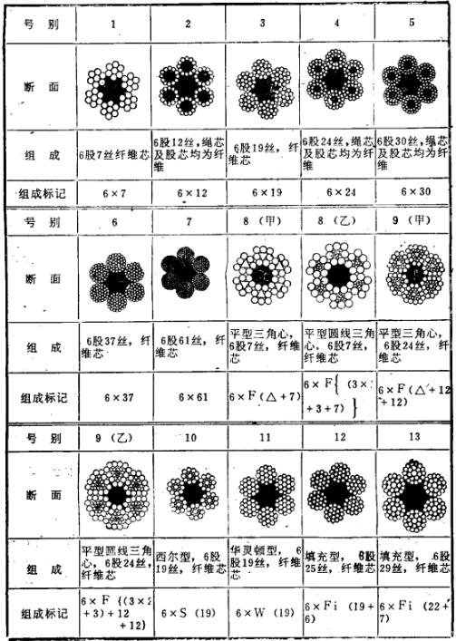 鋼繩的選用應符合JIS G3525的規定,鋼繩的組成見表4-12,共有1-17號共17中類型,用于起重機及卷揚機上的剛繩主要是3、6、7、10、及13號的A類。各類型鋼繩的破斷載荷及重量見表4-14/5-15及4-16.