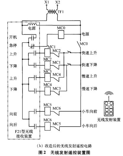 無線遙控裝置主要是解決工作人員拖拽電纜帶來的安全隱患。無線遙控裝置采用F21一E 1B無線控制設備,裝 BJX 防爆接線箱內實現防爆性能。該裝置把無線接收裝置接入電動葫蘆上的控制回路,用接收裝置內繼電器控制板替代原按鍵的開關量進行控制;無線發射裝置(遙控器)控制繼電器控制板的動作。兩臺電動葫蘆無線控制裝置采用不同頻率的電路板進行控制,以避免誤動作。控制回路電路圖如圖2所示。