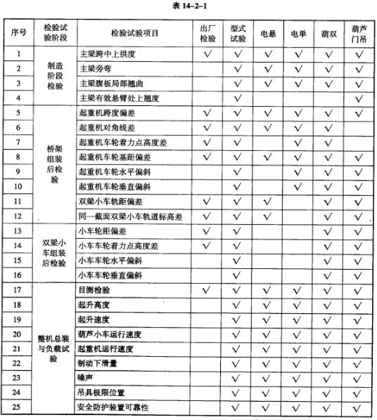 (1)電懸、電單、葫雙和葫蘆門吊的檢驗項目如表14-2-1所示。